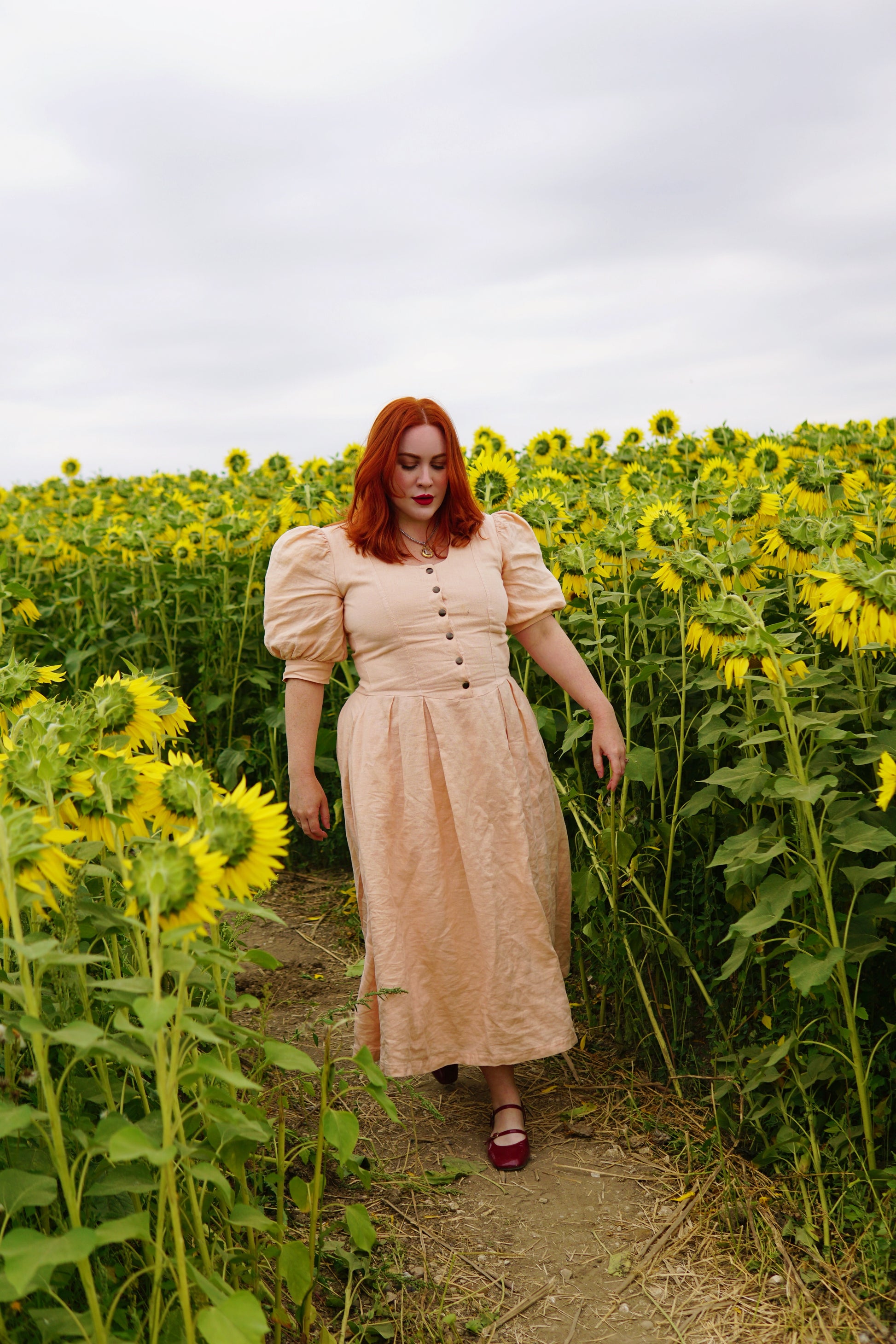 The silhouette balances romance and ease: voluminous puff sleeves with adjustable cuffs for a custom fit, a gently corseted waist that ties at the back for flexibility, and a softly pleated swing skirt that moves with you. A full cotton lining ensures comfort, while discreet side pockets and vintage-inspired aged brass snaps down the front add function and character.