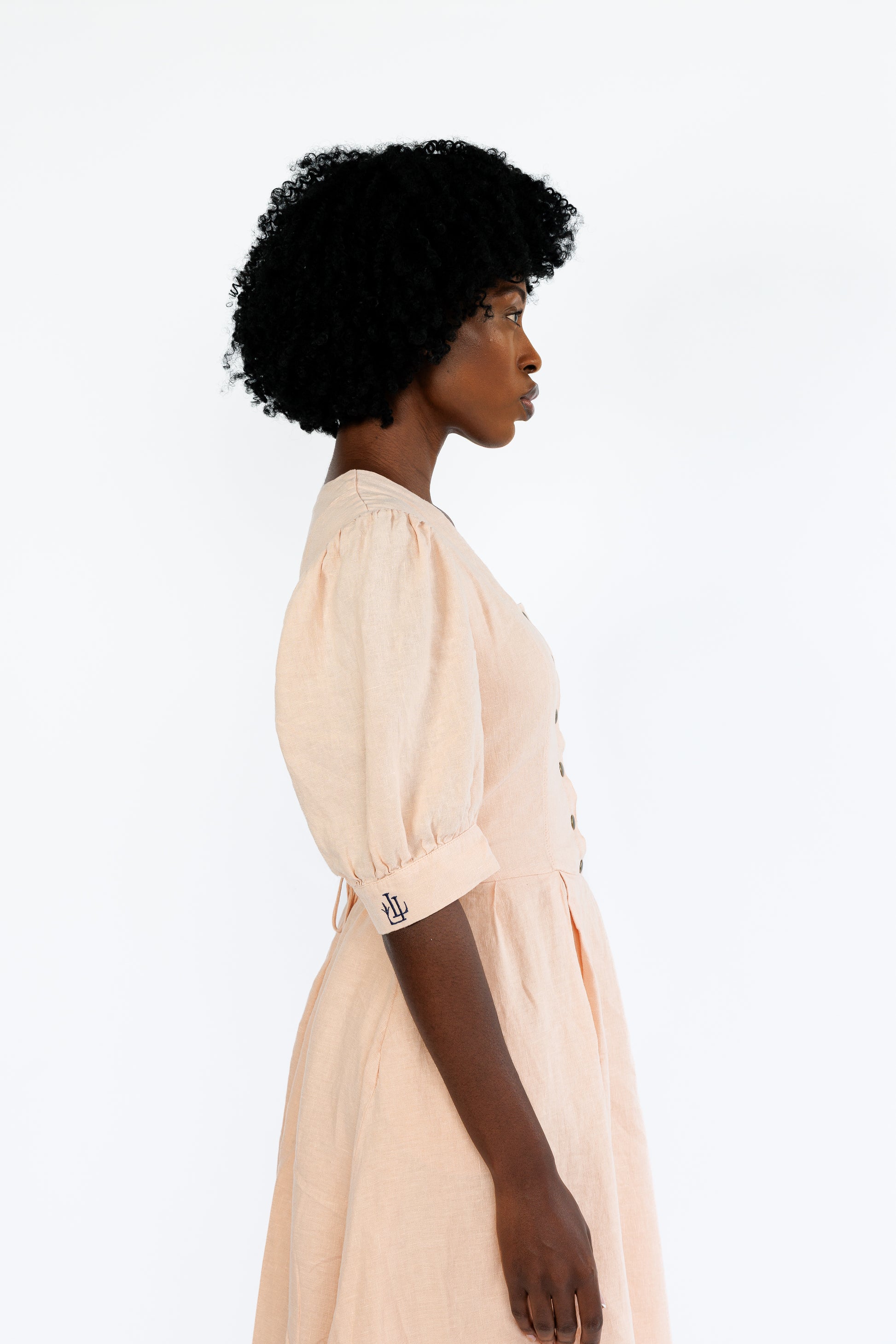This natural linen dress blends elegance with practicality. Voluminous puff sleeves with discreet buttons allow for a customizable arm fit, while the innovative tie pulley system at the back ensures a perfectly snatched waist every time, making it ideal for fluctuating body sizes.